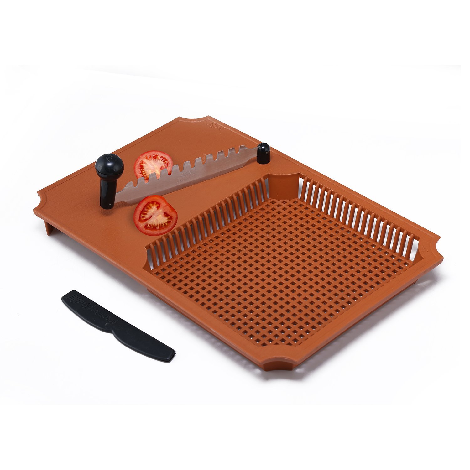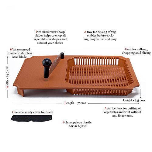 A perfect tool for cutting of vegetable and fruit without any finger cuts. Two sided razor sharp blades helps to chop all vegetables in shapes and sizes of your choice. A tray for rinsing of vegetables before cooking. Asy to use and easy to clean.