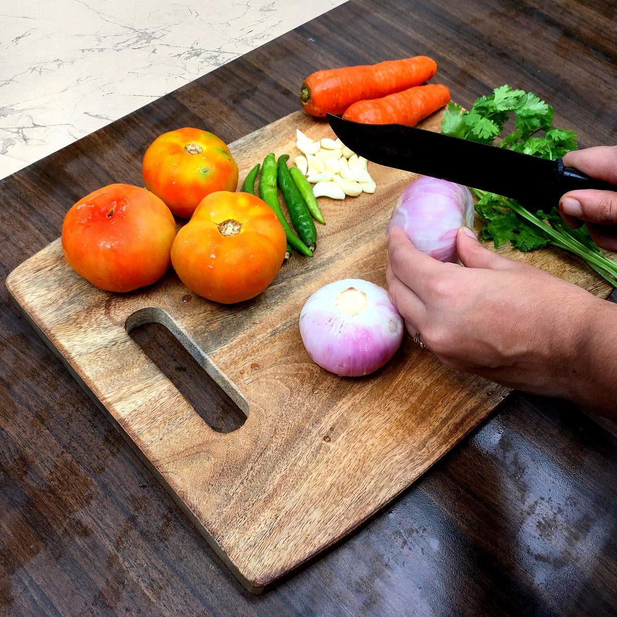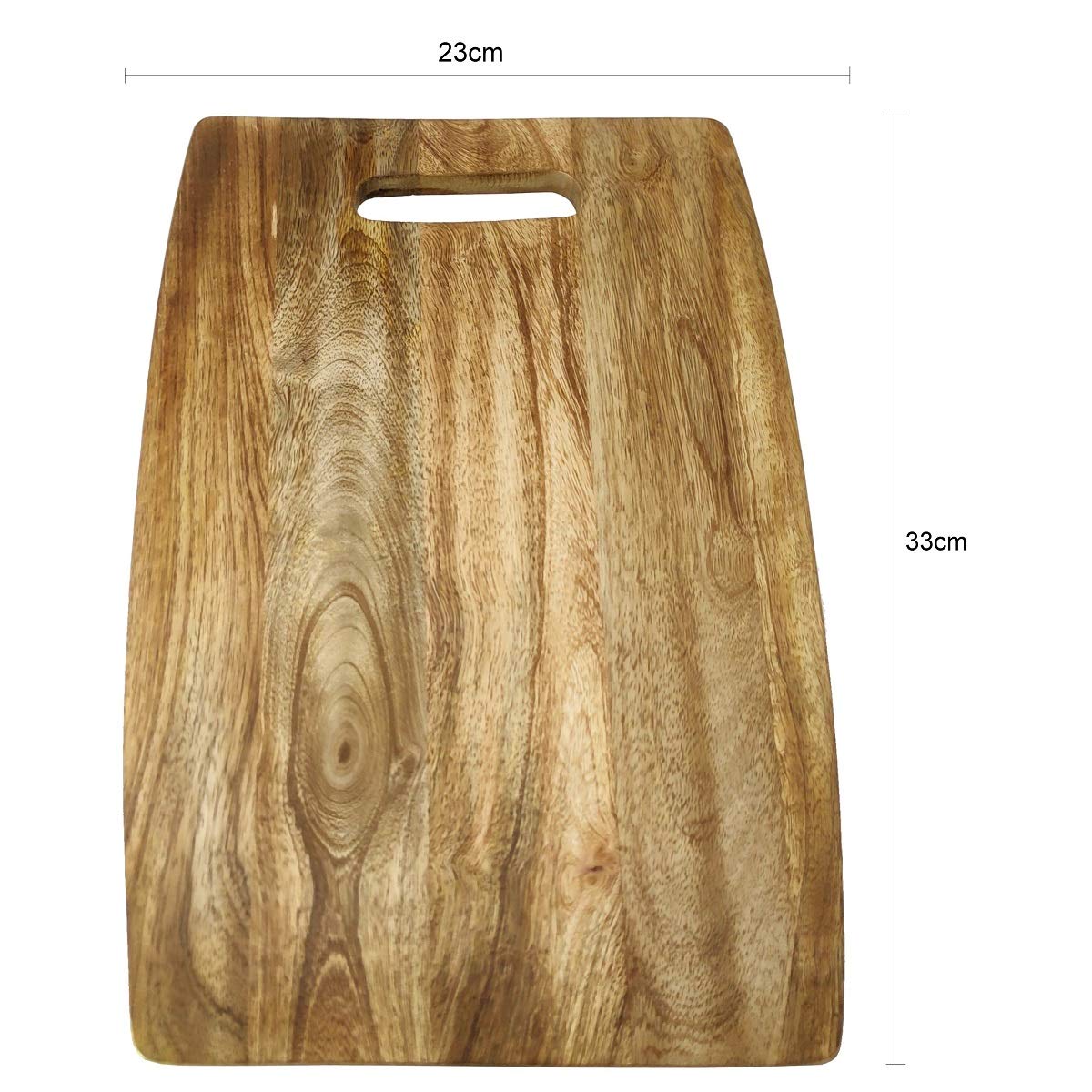 Dress up your kitchen or your dining table with Sahya Dale cutting boards that feature unique decorative edge-grain patterns. These durable butcher block cutting boards protect your counter and add style to your kitchen. Made from beautiful edge-grain Mango wood; 33cm x 23cm x 2cm cutting carving and prep station board by Sahya Dale. Richest hues of the wood combined with the most sophisticated wood grains provide a unique piece that combines function and magnificent artisanship. Environmentally friendly plantation-grown Mango wood is known for its versatility function beauty and sustainability. Dimensions: 33cm L x 23cm W x 2cm H Material: Mango wood Color: Brown Type: Wood Cutting Board