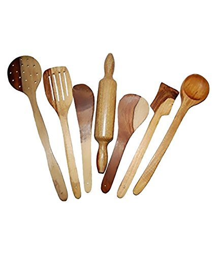 Handmade Wooden Serving and Cooking Spoon Kitchen Utensil 6 Spoon & 1 Rolling Pin This spoon set is made from high quality wood. Wooden Serving and Cooking Spoon Kitchen Utensil set of 6 Multipurpose Serving and Cooking Spoon Set Your cooking and dining experience can be greatly enhanced by using the right set of spoon sets. Made from pure wood the Handmade wooden spoon set is an ideal solution for cooking as well as serving your favourite dishes. Available in a set of 5 different spoons that can be used for serving various items such as rice dal sabzi and for cooking rotis dosas omelettes and more this set is a great addition to your kitchen tool set. Made from High Quality Material Ideal for Daily Use Constructed using high quality wood the Handmade wooden serving and cooking spoon set is perfect for cooking use as unlike plastic it does not leech harmful chemicals into your food. Also its non-abrasive wooden construction makes it ideal for use with non-stick cooking utensils unlike metal-based spoons. Elegant and Ergonomic Design Easy to Maintain Furthermore the ergonomic design of these spoons makes them easy to use and handle for daily purposes. Featuring lengths between 10 and 15 inches these spoons and spatulas have the perfect size required for efficient cooking. Due to their sturdy construction cleaning these spoons is a fairly easy task. Wash the set in boiled water before its first time use and use a simple liquid detergent solution to wash it after every subsequent use.