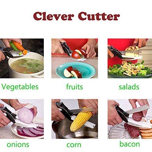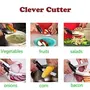 Clever Cutter is going to revolutionize your kitchen with the way it chops through anything in seconds. It's premium design that includes pressure handle with spring enables faster cutting. This is the right time to buy clever cutter in India. Fruits meats veggies or bread - it's premium blade and wide mouth makes it easier for Indian women to have ultimate experience of kitchen mastery that's fast and mess-free. The blade is made of premium stainless steel and handle is made of A-grade plastic giving you perfect combo of brilliant design efficiency and effectiveness. This is perfect kitchen tool in India to make perfect salads kabobs and much more. HIGH PRECISION & ERGONOMIC COMFORT: The smart ergonomic scissors design allows you to slice and chop even larger foods like corn or chunks of meat with only a push of the handle without applying a lot of pressure while the razor sharp angled stainless steel blades will easily take up any challenge without straining your hands. Equipped with a safety lock button for safe storage in your kitchen drawers.