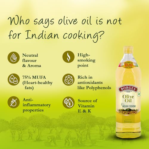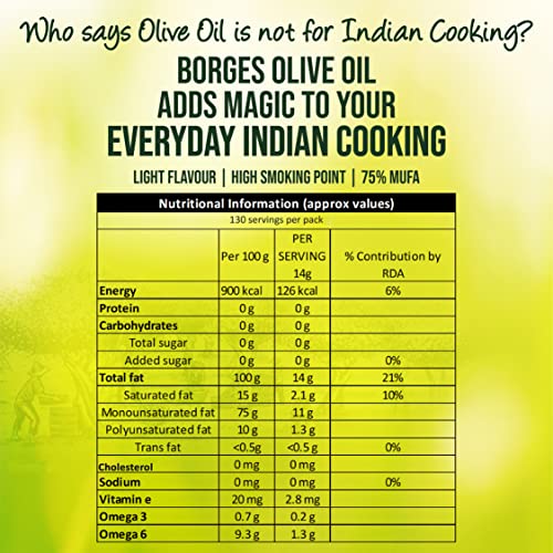 Product Description Borges belongs to the Mediterranean region. Mediterranean diet is considered to be one of the healthiest diets in the world and olive oil is an important ingredient in it. Borges launched its world famous olive oils in India with an aim to introduce Indian consumers to the fact that various variants of olive oil are relevant for their kitchens as well. World-renowned brand which is recognized as a leader in oils and vinegars. An extensive international network; presence in over 105 countries. Guaranteed Quality and Traceability of our products. From the Manufacturer FeaturesLight flavor with high smoking point. Perfect for Indian cooking. no flavour of olives can substitute any regular oil in the kitchen.UsageDal and VegetablesPulaoDosaAny Indian Dishview largerAbout the brandBorges belongs to the Mediterranean region; Mediterranean diet is considered to be one of the healthiest diets in the world and olive oil is an important ingredient in it. Borges launched its world famous olive oils in India with an aim to introduce Indian consumers to the fact that various variants of olive oil are relevant for their kitchens as well.World-renowned brand which is recognized as a leader in oils and vinegarsAn extensive international network; presence in over 105 countriesGuaranteed Quality and Traceability of our products