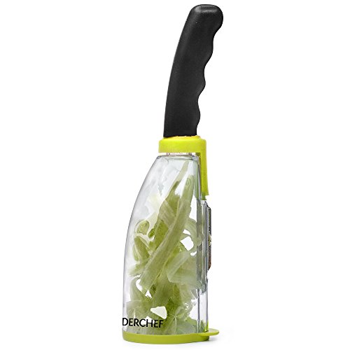INTEGRATED CONTAINER: The peeler includes a transparent container that collects and stores vegetable skins while peeling keeping the kitchen counter clean and allowing for easy disposal.