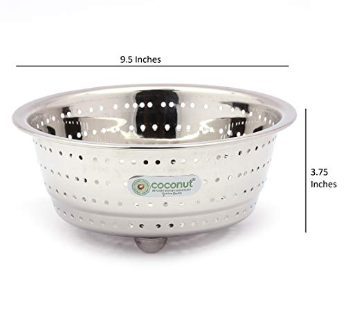 Coconut is range of innovative and quality products for Home and Kitchen. This Stainless Steel Colandar/Strainer is made of premium Quality Stainless Steel material and with food grade. This is ideally used for kitchen in draining RiceDals Fruits Vegetables GrainsPastas Noodles and other foods. This Colander is an essential for kitchenware collections for quick and easy cook.This comes with heavy guage which will be sturdy and long lasting product. Mirror Finish and Dishwasher safe. Product content: Coconut Stainless Steel Colander/Strainer Vegetable Basin Fruit Basket for Kitchen -1 Unit ( Dimension - Width -9.5 Inches and Height -3.75 Inches) .