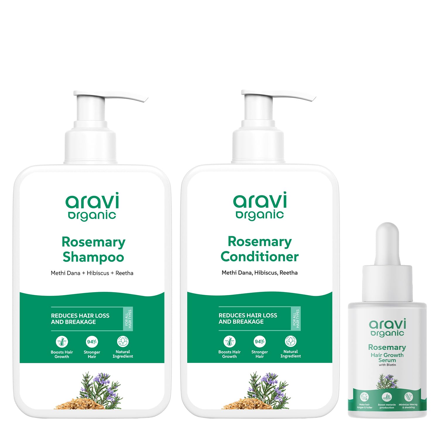 Experience the power of nature with the Aravi Organic Rosemary Hair Care Set featuring a revitalizing Shampoo nourishing Conditioner and lightweight Hair Serum â all infused with pure rosemary extract. This 3-in-1 herbal care combo is designed to deeply cleanse restore moisture and boost hair growth while leaving your scalp refreshed and your strands silky smooth. Crafted with a blend of organic botanicals and essential oils this trio works in harmony to reduce hair fall stimulate hair follicles and strengthen every strand. Whether you're dealing with dullness breakage or thinning hair Aravi Organic brings your hair back to life â naturally and gently.