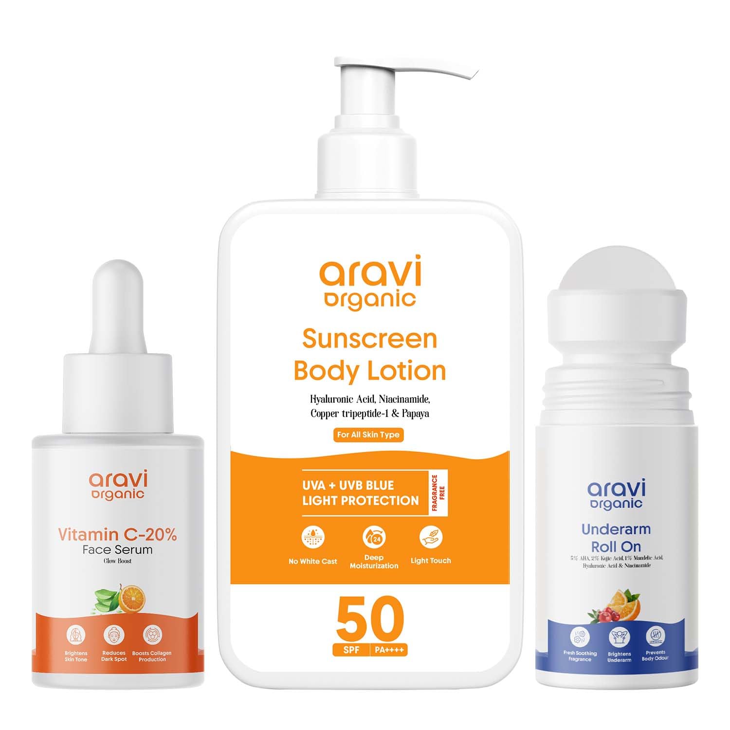 Aravi Organic Vitamin C Face Serum + Sunscreen Body Lotion + Under Arm Roll On Brightening Sun Protection & Freshness Skincare Trio