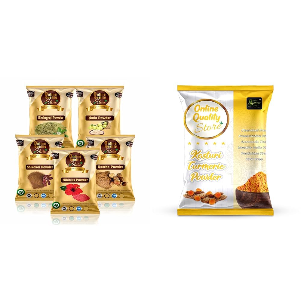 Online Quality Store Amla Reetha Shikakai Bhringraj and Hibiscus Powder for Hair (Pack of 5 50g each Total 250g Pack) & Kasturi Haldi Powder Combo for Hair and Face_100 (100 g)