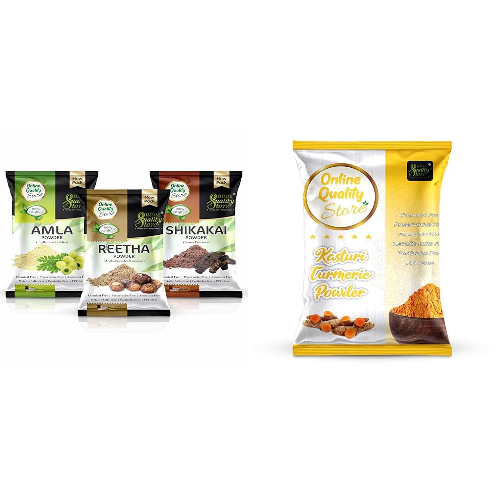 Online Quality Store Amla Reetha Shikakai Powder Combo powder Pack for Hair r (Pack of 3 Total 380g Pack) & Kasturi Haldi Powder Combo for Hair and Face_100 (100 g)