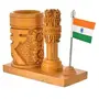 WOOD CRAFTS OF RAJASTHAN Wooden Handmade Carved Rupee Design Ashok stambha Pen Stand with Flag | Gift For Family & Friends Home Office Teachers Gift Thank You Gift House Warming New Year Promotion