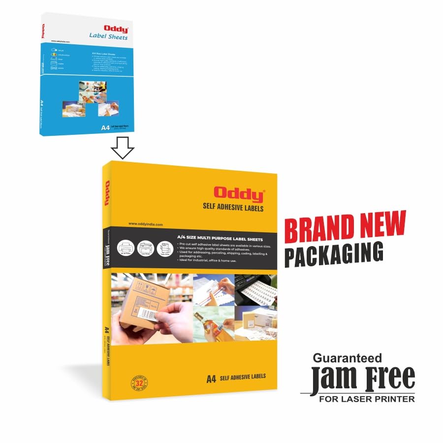 When you need a label that's going to stick around these Oddy A4 Self Adhesive Sticker Labels are just the tool you're looking for. The white rectangular labels are easily customizable and suitable for a variety of purposes. Apply them as identification markers on any number of different objects. They can be used on documents for mailings tracking items Barcodes and labeling packages and more. Whatever your mission the permanent adhesive ensures that your label will stick to its task staying just where you put it. Oddy stickers can be used as Permanent Identification Labels Create an organized workplace by marking property containers and shelf space. These labels stand up to frequent use and resist moisture scuffing tearing and smudging. These self-adhesive labels comes with premium quality adhesives Stick your labels on any surface — from cardboard to styrofoam! oddy self-adhesive sticker sticks and stays. A4 Size Self Stick Labels are available in Various sizes of Labels. Ensure high-Quality Standards of Adhesives specially to withstand Inkjet Laser printers. Easy to use software guide with every packet. Use for addressing Parceling Shipping Coding & Labeling etc. Ideal for home and office use. Permanent adhesive ensures bright white labels stay secure. Set Content:-1 Packet (100 Sheets). Label Size (MM):-139.6 X 99.1 Label Size (Inch):-5.47 x 3.90