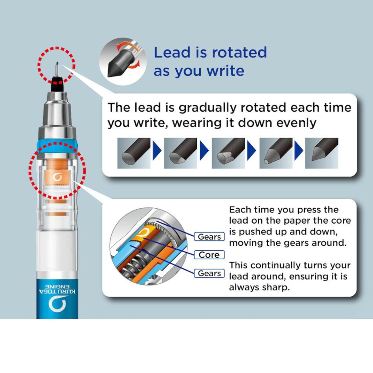 A Special mechanical pencil with gears inside that revolve as the pencil lead presses down and lifts off the paper. Each time you write the lead moves fractionally to maintain an even sharpness. The mechanical pencil with the revolving lead that STAYS SHARP. Revolving lead that stays sharp ! Does not break Easily 360 degree auto-rotating lead system.