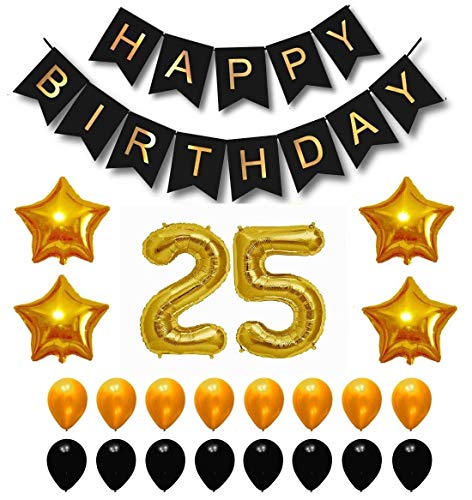 • This Pack Include Gold Color Foil Balloon 25 Number - 16 Inch 30 pcs Gold & Black Latex Balloon 1 pc Black Happy Brthday Banner Premium Quality Paper Four Gold Star Foil Balloons