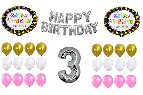 Brthday Decoration Balloons - Pink White Gold Foil & Number Balloon (Three)