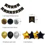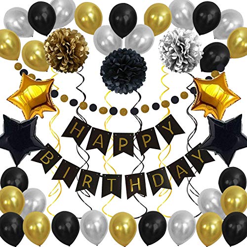 VALUE PARTY PACK INCLUDING: 1 x black "HAPPY BrthDAY" banner black / gold / silver party latex balloons (10pcs each color) black / gold / gray paper Pom Poms (1pcs each color) 4pcs foil star balloons (2pcs gold+2pcs silver) . Our great set of Black and Go