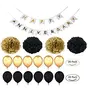 Anniversary Pack Includes - Happy Anniversary Banner with Gold Black Balloon & 2 Golden Pom Pom & 2 black pom pom - 14 Inch Each