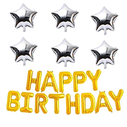Happy Brthday Foil Letters Balloon Banner with 6 Silver Star Foil Balloon for Brthday Party