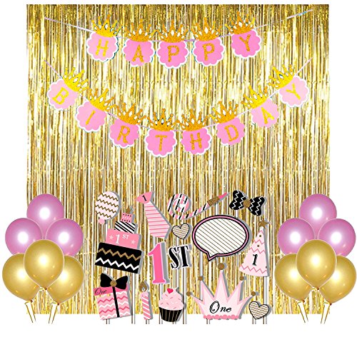1 Set Happy Brthday Crown Banner + 15 Pieces Girls 1st Brthday Photo Booth + 25 Pic Pink And Golden Balloon + 3 Pieces golden foil curtain