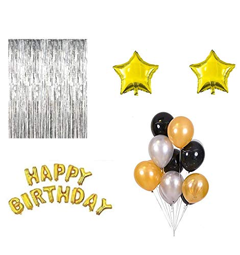 Size:Pack of 50|Color:Happy Brthday Golden+Goldenstar+Silvercurtain+BalloonHappy Brthday Letter Foil Balloon Set of Golden + 2Pcs Silver Fringe Curtain (3 X 6 Feet) Happy Brthday alphabet letter foil balloon (Golden) set of 13 letters + Pack of 50 pcs Black Gold & Silver balloons Ship Non inflated Height of each letter is approx 16 inches and can cover wall space of about 20 sq. Feet Other balloons in picture only for reference .Complete backdrop for Brthday Suitable for Brthday theme party decorations and Brthday party supplies