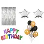 Jindal Party Products Happy Birthday Foil Balloon (Multi) + 2 Pieces Silver Fringe Curtain (3 * 6 Feet) + 2 Star Foil Balloon (Silver) + Pack of 100 Pieces Metallic Balloons (Golden, Silver, Black)