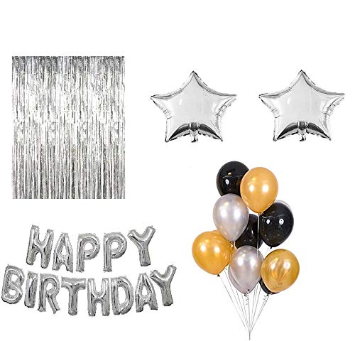 Size:Pack of 60|Color:MulticolorHappy Brthday Letter Foil Balloon Set of Silver + 2Pcs Silver Fringe Curtain (3 X 6 Feet) Happy Brthday alphabet letter foil balloon (Silver) set of 13 letters + Pack of 60 pcs Black Gold & Silver balloons Ship Non inflated Height of each letter is approx 16 inches and can cover wall space of about 20 sq. Feet Other balloons in picture only for reference .Complete backdrop for Brthday Suitable for Brthday theme party decorations and Brthday party supplies