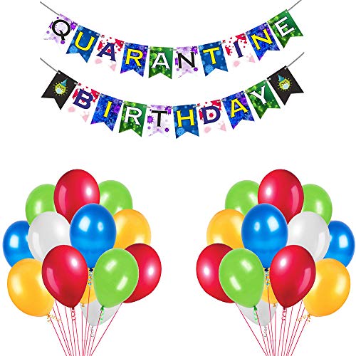 Package include 1Pc Multicolour quarantine banner and 15pcs multicolour latex balloons. Each pennant measures 8 inches high x 6 inches wide. Length of the banner is 86 inch. Happy Quarantine Brthday Bunting Banner is professionally printed on sturdy cardstock paper. Each pennant is individually inspected then carefully packaged by hand. Personalized bunting banners require some easy assembly. All the balloons are made of natural latex balloons thick and strong support air and helium.never heard a pop sound and you won't have to worry about them tearing and bursting when inflated.
