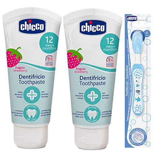 Chicco Strawberry Toothpaste (12 m+), 50 ml, Pack of 2 and Blue Toothbrush