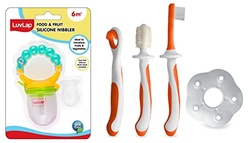 LuvLap Pearly Food & Fruit NibblerFruit nibbler and teething toy to provide gentle relief to gums. Serves dual purpose of feeding fruit and vegetables to babies and can also be used as a teether. Can be filled with chilled fruits/vegetables to provide added relief. Made with bpa free food grade plastic and soft silicone it comes in attractive handle designs to EN gage the baby and is easy to hold and nibble uponLuvLap Baby Training Toothbrush Set with Anti Choking Shield Teeth Tongue Cleaner Baby Oral Hygiene 3 pcs (White/Orange)Lifes little stories bloom with coming of the little one in your life. It completes your life with many joys of parenthood. For baby its the next best thing to being in your arms. Entertain your little one and give him or her a personal resting place. Luvlaps high chairs cots walkers and other indoor products will have the whole household floored by babys happy smiles and chuckles. At Luvlap we endeavour to weave the little stories into our products with an emphasis on child safety and enrichment of features. So that your little one gets the comfort thats next only to the warmth of your lap. Conceived with care and made using the latest marvels of science all Luvlap products undergo multiple quality checks before they are dispatched to the stores. The products are available at all leading baby gear and online stores and conform to the european standards.