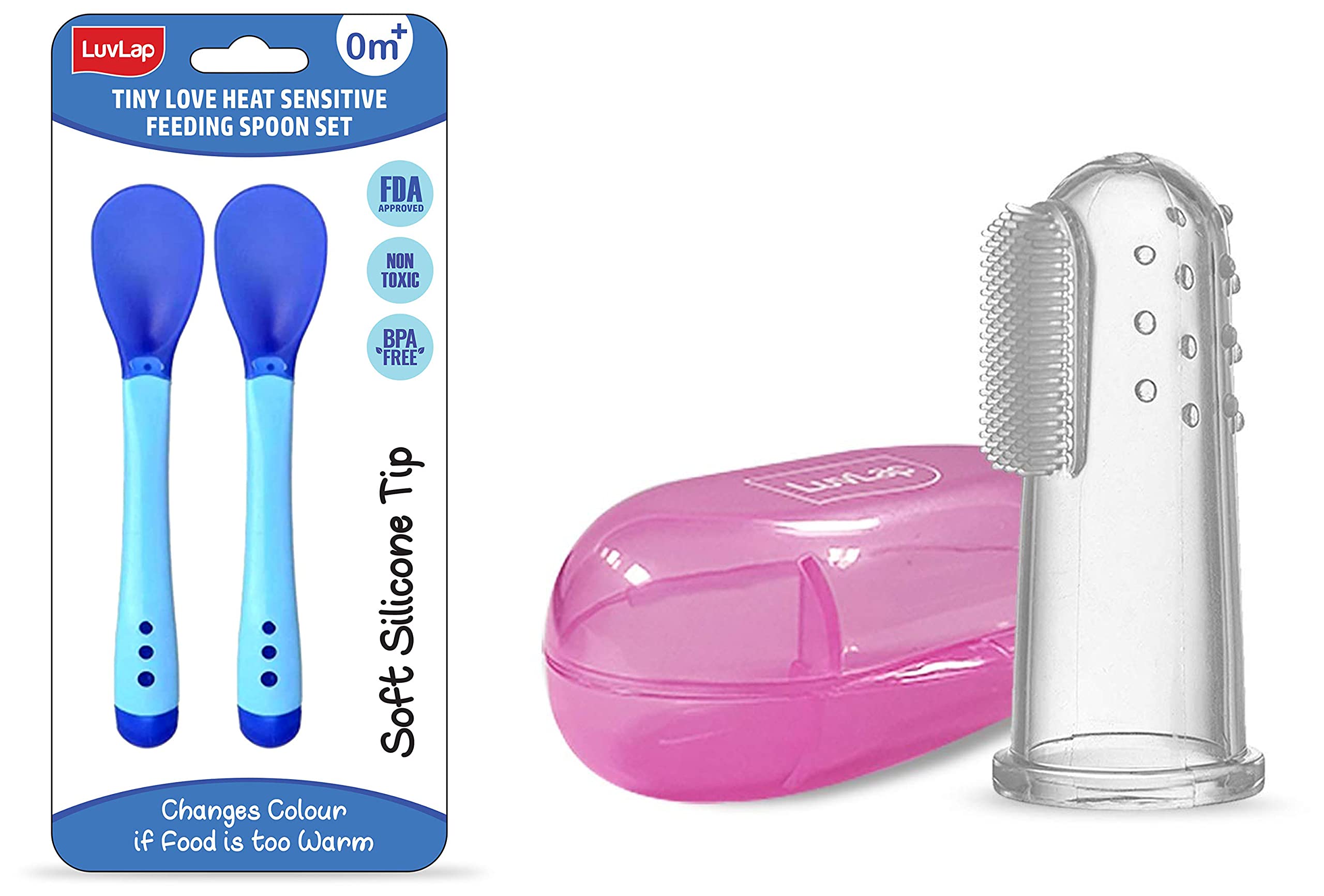 LuvLap Tiny Love Heat Sensitive Baby Feeding Spoons Set Food Grade PP Kids & Baby Spoon with Soft Silicone Tip Color changing BPA Free FDA Apporved 2 pcs BlueLifeÂs little stories bloom with coming of the little one in your life. It completes your life with many joys of parenthood. For baby itÂs the next best thing to being in your arms. Entertain your little one and give him or her a personal resting place. LuvlapÂs high chairs cots walkers and other indoor products will have the whole household floored by babyÂs happy smiles and chuckles. At Luvlap we endeavour to weave the little stories into our products with an emphasis on child safety and enrichment of features. So that your little one gets the comfort thatÂs next only to the warmth of your lap. Conceived with care and made using the latest marvels of science all Luvlap products undergo multiple quality checks before they are dispatched to the stores. The products are available at all leading baby gear and online stores and conform to the european standards.LuvLap Baby Silicone Finger ToothBrush with case for Easy Cleaning Massaging and Soothing Gums Oral HygieneMade from Non Toxic Liquid Silicone. Gently cleans your baby's teeth and gum. Provides relief to the child's tender gums during teething. Includes case for storage and to maintain hygiene.