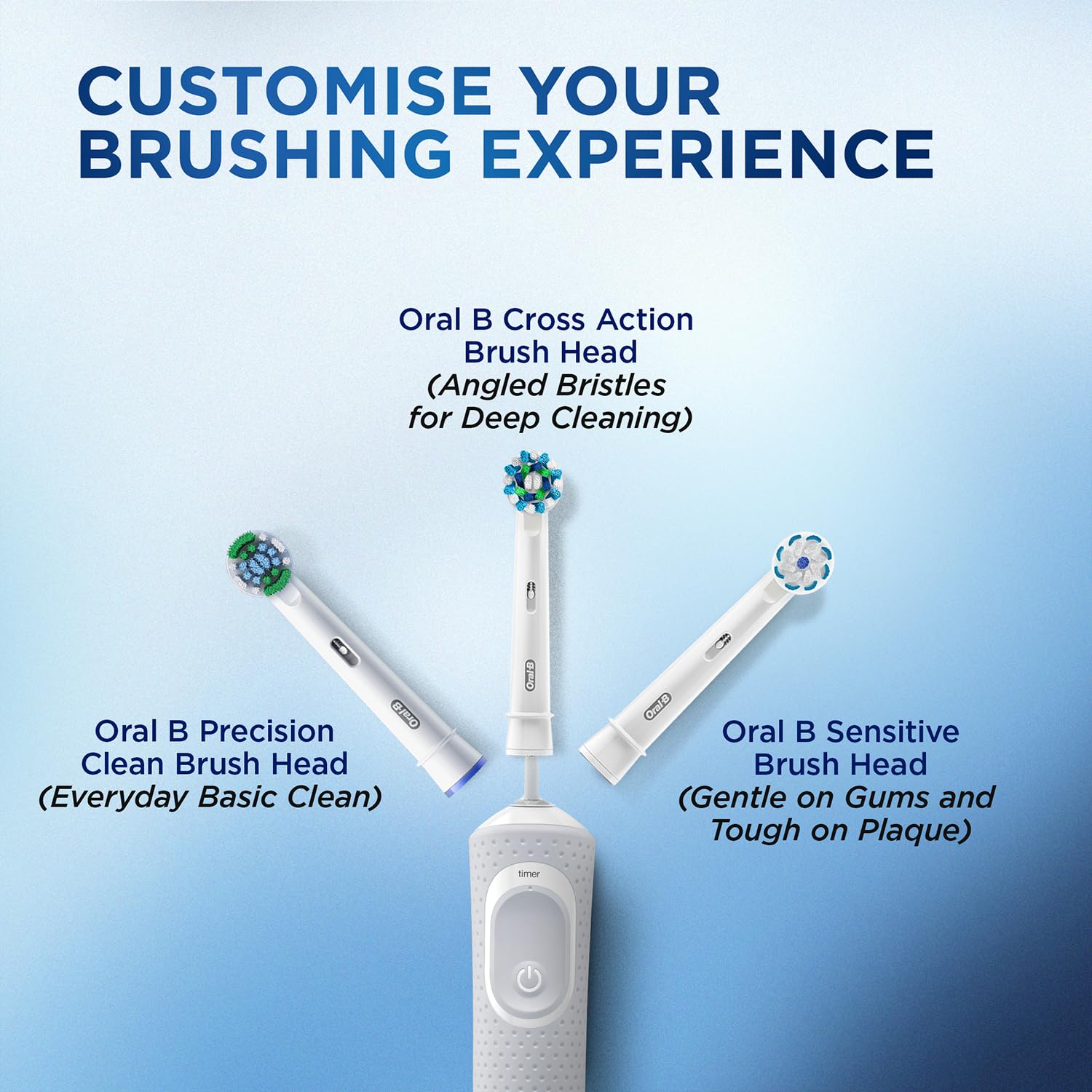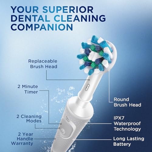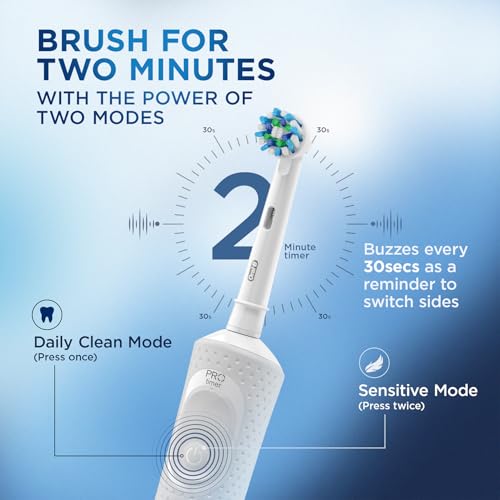 Discover the ultimate oral care with the Oral B White Vitality Rechargeable Electric Toothbrush with Travel Case. Designed for adults this essential toothbrush ensures a superior everyday clean with its 2D Cleaning Action which oscillates and rotates to remove up to 100% more plaque than a regular manual toothbrush. The round brush head cups each tooth providing an exceptional clean while soft crisscross bristles are gentle on your gums. Equipped with a professional 2-minute timer and 30-second quadrant alerts it helps you brush like your dentist recommends ensuring every part of your mouth gets equal attention. The Vitality toothbrush features two brushing modes - Daily and Sensitive catering to both regular and delicate oral care needs. Enjoy the convenience of a long-lasting rechargeable battery and a travel case for on-the-go care. Backed by a 2-year warranty and a 30-day money-back guarantee the Oral B White Vitality Toothbrush combines innovative technology with trusted quality making it the 1 choice recommended by dentists worldwide. Experience the difference in your oral hygiene routine and achieve a healthier brighter smile with Oral B. Compatible with a variety of Oral-B brush heads such as CrossAction Precision Clean Sensitive Clean this toothbrush offers versatile and thorough cleaning.