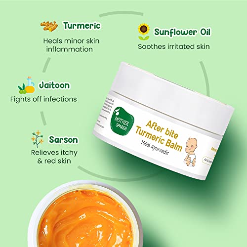Believing in the concept of ayurveda inspired home remedies mother sparsh has prepared after bite turmeric balm which provides relief from insect bite rashes and minor skin irritation. Our mother sparsh after bite turmeric balm is full of natural extracts like turmeric sarso jaitoon and pudina. Its anti- bacterial anti-septic and anti-inflammatory and is therefore helpful for the conditions of eczema itching skin eruptions acne and rashes.