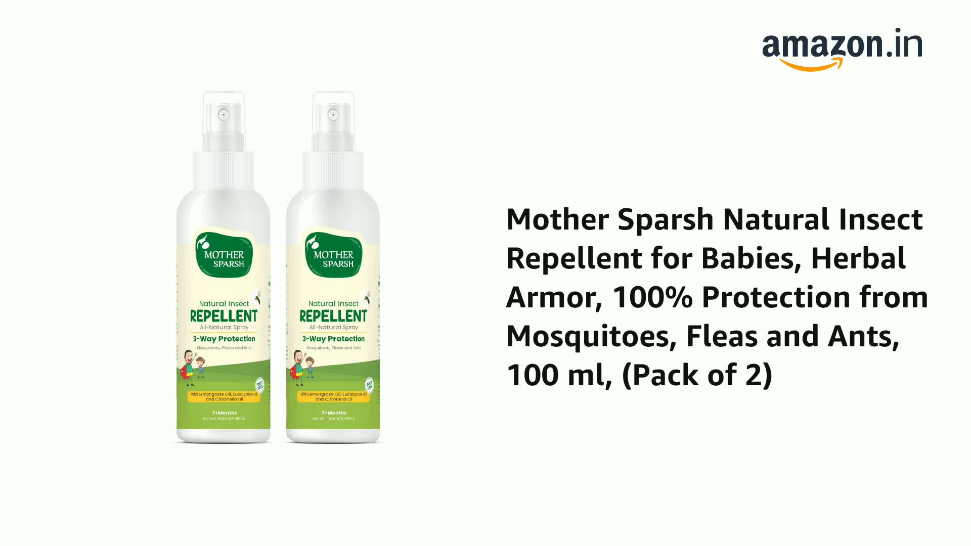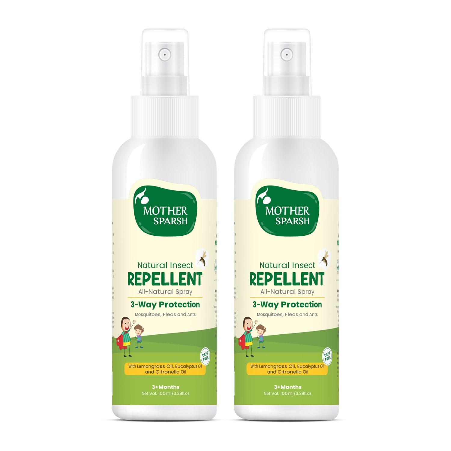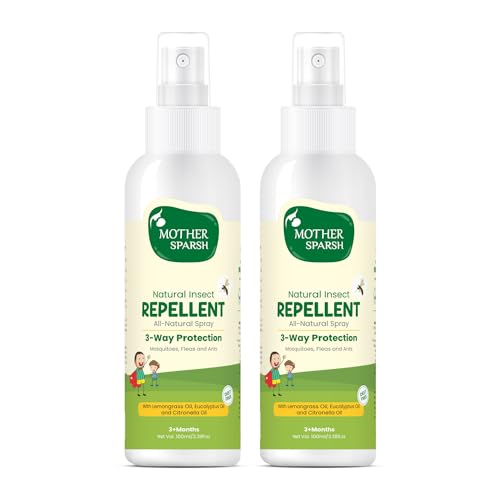 Mother sparsh natural insect repellent is 100% natural and safe product which is formulated with the combination of best ayurvedic herbs. The presence of eucalyptus oil creates a protective shield which protects from mosquitoes fleas and other insects. Additionally it contains essential natural oils such as lemongrass citronella and camphor which provide soothing effect on the skin. This deet free natural insect repellent keeps your baby safe while indoors or outdoors.