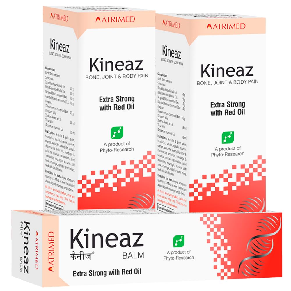 Kineaz Oil & Balm by Atrimed with Extra strong red oil relieves muscle pain Back Aches and Joint pain. Anti-inflammatory components in Kineaz oil and balm Penetrate the skin and give quick relief. Kineaz Oil and balm are made from natural ingredients. These Oil and Balm are a long-term solutions to bone and joint disorders Kineaz Oil and Balm have no side effects and are safe for people of all ages. Kineaz Oil and Balm possesses counter-irritant rebefacient activities and Desensitises sensory nerves. It contains analgesic and anti-inflamatory properties. Kineaz Oil and Balm provides relief from neuro muscular pains. Extra strong with red oil for bone joint & body pain. Kineaz acts as analgesic anti inflammatory rubefacient & desensitizer. Active ingredients in Kineaz penetrate deep into the tissues & inhibits the release of chemical mediators responsible for pain & inflammation in muscle joint & tendon.