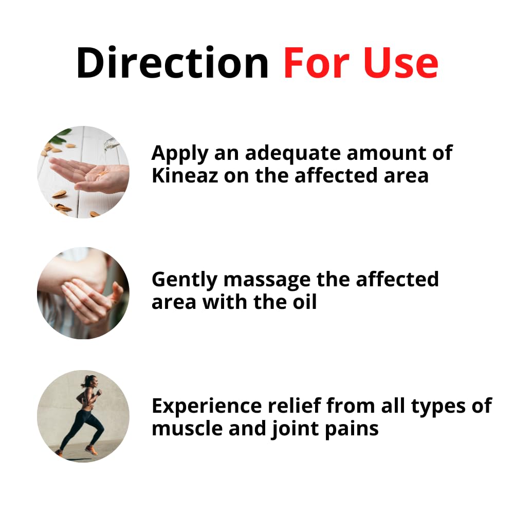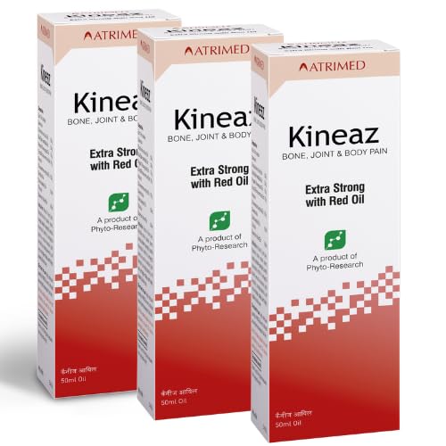 Product Description Atrimed Kineaz Oil is a fast-acting extra-strong Ayurvedic pain relief oil formulated to ease muscle joint and body pain. Enriched with powerful red oil and natural herbal ingredients it penetrates deep into the tissues to reduce inflammation relieve pain and restore mobility. Whether you're dealing with backaches joint stiffness knee pain sprains or headaches Kineaz offers a single solution. Its multi-action formula works as an analgesic anti-inflammatory rubefacient and desensitizer. By targeting the chemical mediators responsible for pain and inflammation it delivers long-lasting relief. Kineaz Oil is safe for people of all elders and contains no harmful chemicals. Itâs non-greasy quickly absorbed and ideal for everyday use to manage arthritis muscle fatigue and neuromuscular discomfort. Developed by Atrimed with deep Ayurvedic expertise Kineaz is a trusted choice for holistic pain management.