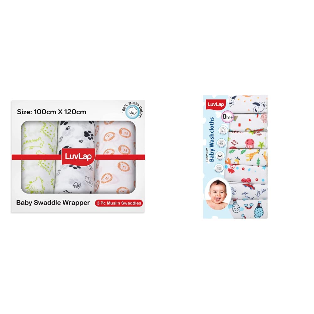 LuvLap Muslin Swaddle Animals WhiteLuvLap is committed to your babys comfort and joy. LuvLaps range of Baby Swaddles gives your newborn a snug cozy womb-like feeling! Made of premium cotton muslin the swaddles are breathable prewashed ultra-soft and softer with every wash. Free from harmful chemicals safe and irritant-free for your baby's most sensitive and tender skin. This is lightweight perfectly sized for swaddling and can serve multiple uses - burp cloth towel stroller cover play mat nursing cover etc.LuvLap Hosiery Cotton Cloth Premium Baby Washcloth for New Born Washable Reusable Absorbent Extra Soft Face Towels/Washcloth for Babies Cherry Print Pack of 7 Pcs MulticolourLuvLap Premium Baby Washcloths are made of stackable knit fabric to ensure maximum comfort for the baby while cleaning him with this