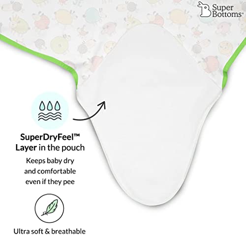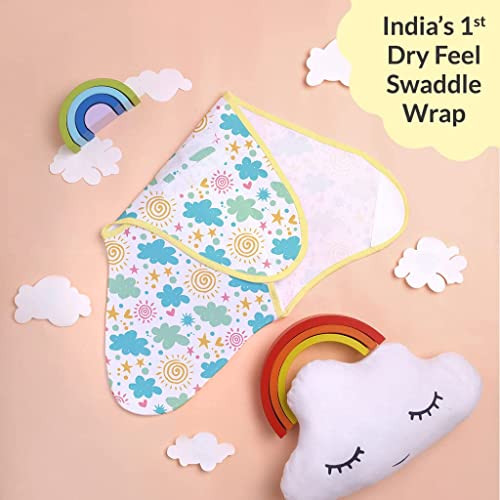 Heres the unique Swaddle Wrap for your little newborn. SuperBottoms Dry Feel Swaddle Wrap creates a snuggly cosy and mummas belly-like space around your newborn baby that makes it feel held and secure. But whats special is It comes with a super soft Cotton Fleece lining also known as the SuperDryFeel layer that keeps the baby dry if it pees. Hence protecting the baby against any discomfort or rashes caused by wetness. The all-new SuperBottoms Dry Feel Swaddle Wrap is super easy and quick to wear in just 3 simple steps Place. Pull. Fix. It comes with adjustable length + tightness and velcro straps. Fits comfortably and helps to hold in the baby's own jerky movements that can hamper sleep. It is just the perfect wrap to keep the baby rested & joyful all day!