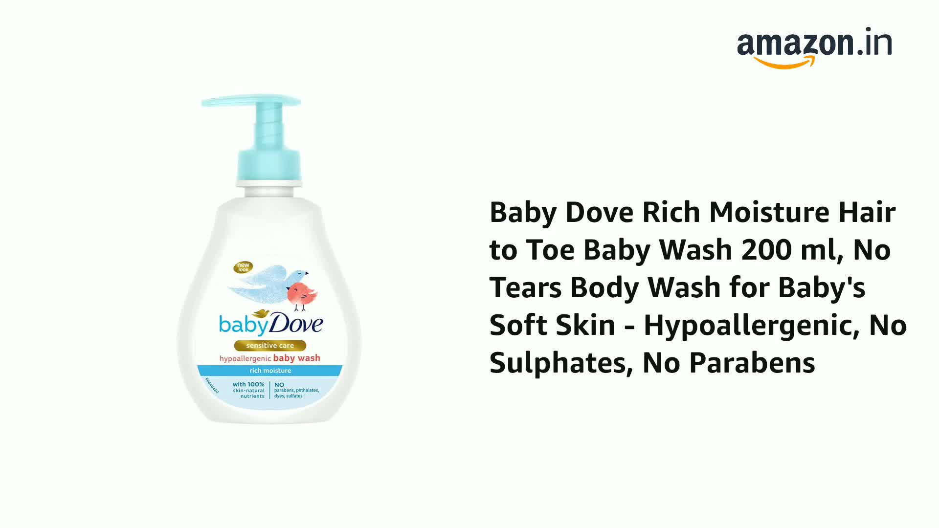 As a mother you know that bath time is precious. But did you know baby delicate skin is 30% thinner than an adult and hence after every bath baby's skin loses moisture upto 5 times faster than yours and can become dry. Our unique Baby Dove Rich Moisture Hair-to-Toe Baby Wash goes beyond mildness tis not only mild and gentle but also helps replenish the essential moisture and nutrients of the skin lost through bathing. Its pH neutral formula produces a rich creamy lather for skin that is clean effectively moisturised soft and delicately scented. The product is made with 100% skin-natural nutrients for delicate baby skin (contains nutrients that are 100% identical to those naturally found in skin) Its tear free and hypoallergenic formula is ophthalmologist dermatologist and pediatrician tested so you can feel safe in the knowledge that your baby skin is getting the extra special care it deserves. Baby Dove Rich Moisture Head to Toe wash formulation is free from added Parabens Dyes and Phthalates and completely safe to be used on Baby delicate skin. Massage your baby with Baby Dove Massage oil before bath and use Baby Dove Lotion after bath for the best moisturisation of your baby delicate skin.