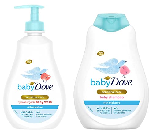 Baby Dove Rich Moisture Baby Shampoo 400 ml Mild No Tears Shampoo - Hypoallergenic No Sulphates No ParabensAs a parent you know that baby's skin needs extra special care. But did you know that after every bath baby's skin can lose moisture up to 5 times faster than yours? That why our baby dove rich moisture shampoo helps replenish essential moisture and nutrients in the scalp as it gently cleanses. Baby dove rich moisture shampoo has a hypoallergenic and ph neutral formula that dermatologically and pediatrically tested. With a ph neutral formula and enriched with our ¼ moisturising cream that prevents dryness it keeps your baby hair feeling soft and also gives your baby a visibly healthy scalp. And with the delicate fragrance you can simply enjoy those special bath time moments with your little one safe in the knowledge that youre giving them the care they deserve. Baby dove rich moisture shampoo is created with no parabens no dyes and no phthalates. To sum it up baby dove rich moisture shampoo is hypoallergenic tear free dermatologically pediatrically and ophthalmologically tested. It is created with no parabens dyes or phthalates leaves your baby hair and scalp feeling soft and the fragrance is specially developed for your baby delicate skin. Try baby dove rich moisture shampoo and feel the difference.Baby Dove Rich Moisture Hair to Toe Baby Wash 400 ml No Tears Body Wash for Baby's Soft Skin - Hypoallergenic No Sulphates No ParabensAs a mother you know that bath time is precious. But did you know baby delicate skin is 30% thinner than an adult and hence after every bath baby's skin loses moisture upto 5 times faster than yours and can become dry. Our unique Baby Dove Rich Moisture Baby Wash goes beyond mildness tis not only mild and gentle but also helps replenish the essential moisture and nutrients of the skin lost through bathing. Its pH neutral formula produces a rich creamy lather for skin that is clean effectively moisturised soft and delicately scented. The product is made with 100% skin-natural nutrients for delicate baby skin (contains nutrients that are 100% identical to those naturally found in skin) Its tear free and hypoallergenic formula is ophthalmologist dermatologist and pediatrician tested so you can feel safe in the knowledge that your baby skin is getting the extra special care it deserves. Baby Dove Rich Moisture Head to Toe wash formulation is free from added Parabens Dyes and Phthalates and completely safe to be used on Baby delicate skin. Massage your baby with Baby Dove Massage oil before bath and use Baby Dove Lotion after bath for the best moisturisation of your baby delicate skin.