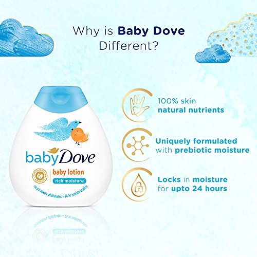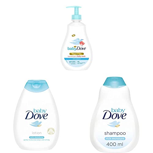 Baby Dove Rich Moisture Baby Wash Tear Free No Parabens No Sulphates No Phthalates 400 mlAs a mother you know that bath time is precious. But did you know baby delicate skin is 30% thinner than an adult and hence after every bath baby's skin loses moisture upto 5 times faster than yours and can become dry. Our unique Baby Dove Rich Moisture Baby Wash goes beyond mildness tis not only mild and gentle but also helps replenish the essential moisture and nutrients of the skin lost through bathing. Its pH neutral formula produces a rich creamy lather for skin that is clean effectively moisturised soft and delicately scented. The product is made with 100% skin-natural nutrients for delicate baby skin (contains nutrients that are 100% identical to those naturally found in skin) Its tear free and hypoallergenic formula is ophthalmologist dermatologist and pediatrician tested so you can feel safe in the knowledge that your baby skin is getting the extra special care it deserves. Baby Dove Rich Moisture Head to Toe wash formulation is free from added Parabens Dyes and Phthalates and completely safe to be used on Baby delicate skin. Massage your baby with Baby Dove Massage oil before bath and use Baby Dove Lotion after bath for the best moisturisation of your baby delicate skin.Baby Dove Rich Moisture Nourishing Baby Lotion -24 Hr Moisturisation Hypoallergenic No Parabens No Sulphates No Phthalates 400 mlAs a parent you know that baby's skin needs extra special care. But did you know that after every bath baby's skin can lose moisture up to 5 times faster than yours? The best lotion for babies should give the gentle nourishing care their delicate skin needs. Bathing can lead to skin dryness so use baby dove rich moisture baby lotion to help replenish the essential moisture in your baby skin for up to 24 hours. It moisturizes and replenishes your baby precious skin barrier. From the very first use this lotion for baby soothes and hydrates to provide moisture for your baby skin and it dermatologically and pediatrically tested so you can feel safe in the knowledge that your baby skin is getting the extra special care it deserves. Plus the gentle hypoallergenic and ph neutral formula of this baby dove nourishing baby lotion is suitable to use even on your new-born.