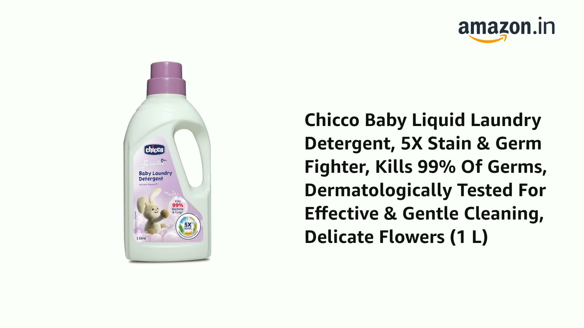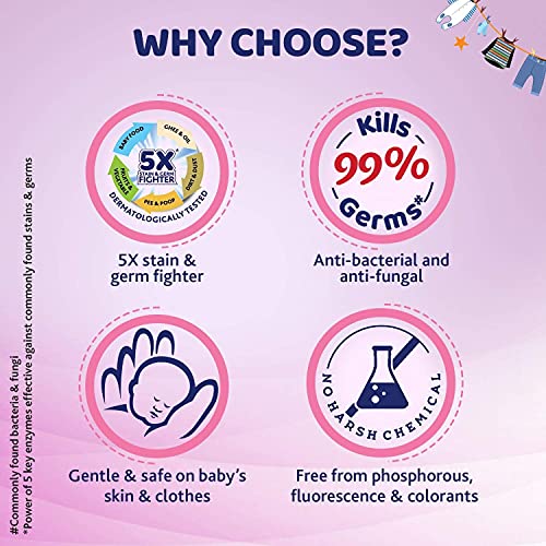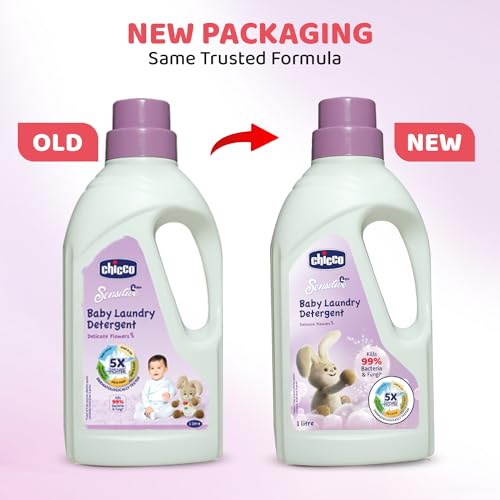 Chicco Baby Laundry Detergent has been specially formulated to effectively clean babyâs clothes by removing tough stains & odour leaving clothes delicately fragrant. It has a unique combination of 5 key enzymes that are effective against almost all types of stains and germs that a babyâs clothes are prone to get such as baby food ghee-oil fruits-vegetables pee-poop and dirt-dust. With anti-bacterial and anti-fungal properties Chicco baby laundry detergent gives your little oneâs clothes a thorough and hygienic wash by killing 99% of commonly found bacteria and fungi. It is Dermatologically tested on sensitive skin and is free from phosphorous fluorescence brighteners & colorants thus keeps the clothes gentle and delicate on babyâs skin thereby causing no irritation or discomfort. Comes with a measuring cap that helps to easily measure the right amount of detergent required for washing clothes. Suitable for both hand wash and machine wash Chicco Baby Laundry Detergent is available in two amazing variants that will keep the clothes delicately fragrant.