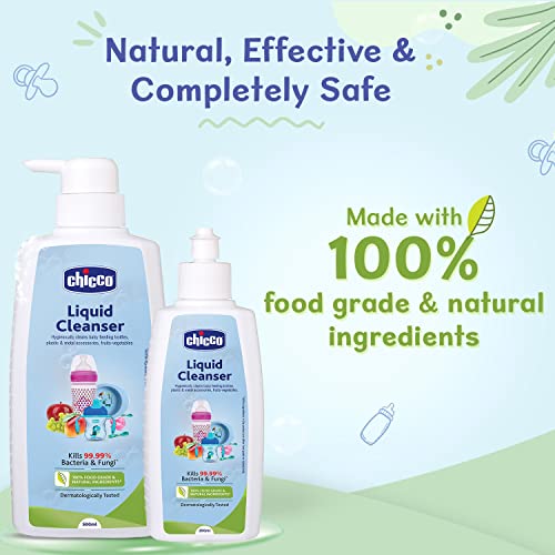 Effective & Safe cleaning of baby feeding essentials: Chicco Liquid Cleanser is specially designed to provide hygienic & safe cleaning for baby feeding essentials like feeding bottles nipples sipper cups pacifiers gum massagers plastic and metal feeding accessories and even fruits and vegetables