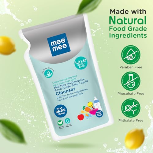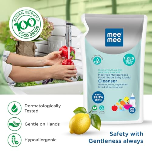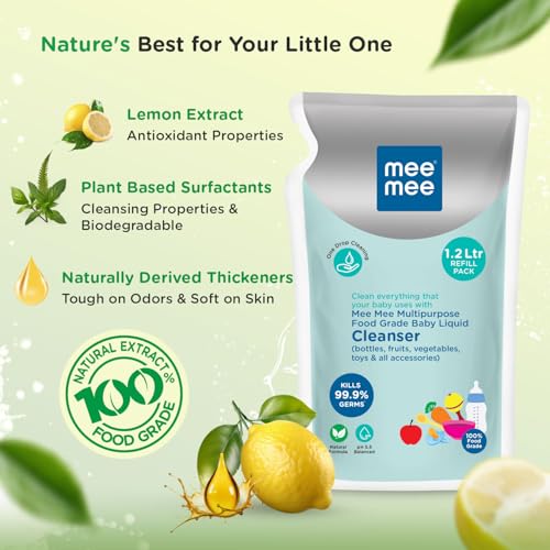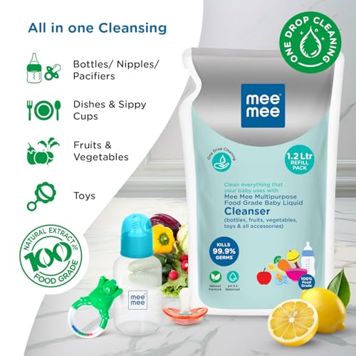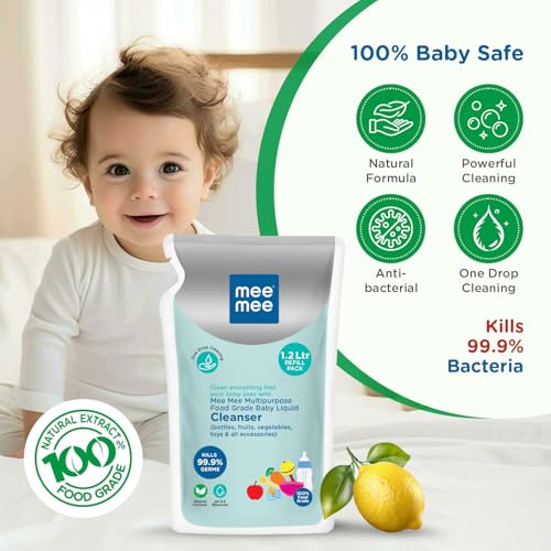 Mee Mee Food Grade Liquid Cleanser 1.2 L | Anti-Bacterial, Kills 99.9% Germs, 100% Natural Formula | For Baby Bottles, Accessories, Toys, Fruits & Veggies | One Drop Cleaning, Dermatologically Tested