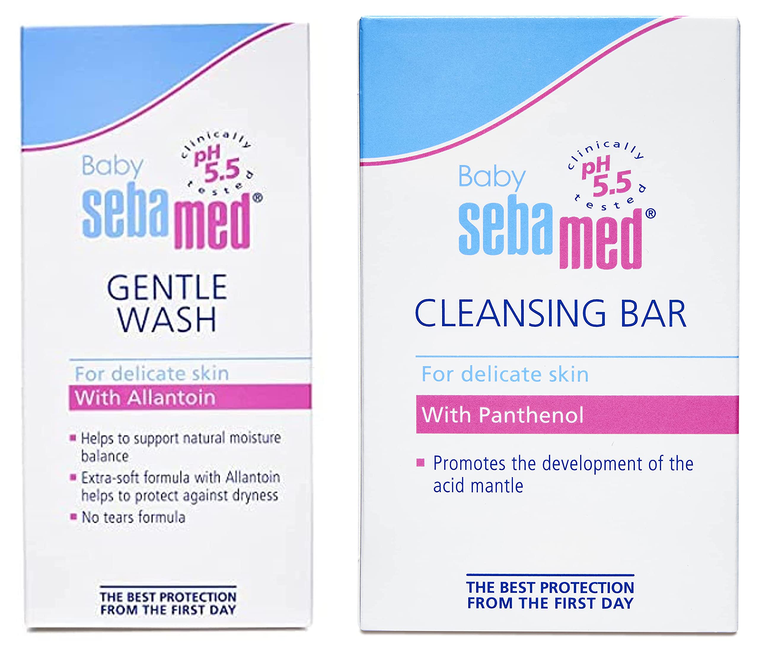 Sebamed Baby Cleansing Bar (150g)Sebamed baby bar has ph of 5. 5 And sugar based mild cleanser. Other baby soaps have ph greater 7 which leads to barrier damage. When baby is born skin ph is 7. The acid mantle which protects the baby's delicate skin takes a few weeks to 3 months to develop the ph of skin then becomes 5. 5. At ph 5. 5 Alone the skin's protective barrier remains intact. It has been clinically proven that only at ph 5. 5 The lipid and moisture loss is minimum and the growth of pathogenic bacteria is restricted. Sebamed baby bar is free from irritants and hence has 0 percent incidences of irritant reactions. Sebamed baby bar contains botanical ingredient hence the reported incidence of allergic reaction is 0. 000003 Percent. Only at ph5. 5 The baby's delicate eyes are not irritated and the tear free formula is free from formaldehyde made in germany100 percent soap and alkali free refatting compounds protect against dryness and lipid removal during cleansing moisturizing complex with wheat germ oil vitamins and amino acids nourishes and hydrates the baby's skin reducing water loss through the skin supports the natural lipid balance panthenol stimulates the regeneration of the skin chamomile soothes the skin pleasant botanical fragrance ideal from one month onwards clinically proven. How to Use: Please wet the body of your baby with water and rub a little bit of Sebamed baby bar on your palms with water and form a bit of lather and gently apply on your baby body and face and thoroughly rinse your baby body with water. Avoid vigorous scrubbing of any area of the skin with Sebamed baby cleansing bar. You can gently cleanse the exposed areas more prone to germs (face hands and legs) several times a day. Please note that Sebamed Baby bar does not lather as much as other baby soaps as it does not contain irritants which create lather and cause skin dryness and irritation.Seba med gentle baby wash ( 50ml)Sebamed baby wash extra soft has pH of 5.5 and has sugar based mild cleanser. Other cleansers for baby have pH>7 which leads to barrier damage.