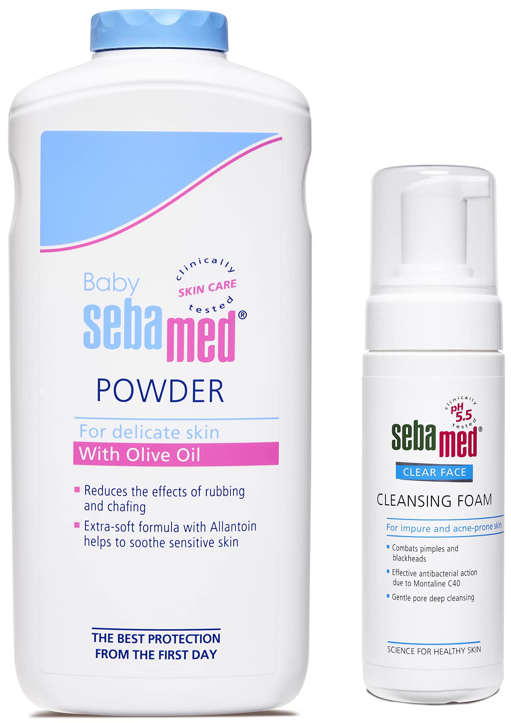 Sebamed Baby Powder 200gMicronized form of tio2 reduces the effect of rubbing and chafing. Absorbs extra moisture from baby's skin to help skin feel comfortable. Extra soft formula with Allentown helps in protecting baby's delicate skin against irritation. Olive oil present in seamed baby powder soothes and protects baby's skin from dryness. Made in Germany olive oil soothes and protects the baby's skin from dryness allantoin makes the skin soft and smooth pleasant botanical fragrance ideal from one month onwards0 percent irritant reactions and almost 0 percent allergic reactions.SebaMed Clear Face Cleansing Foam 150mlSebamed clear face foam 150ml is an anti-bacterial cleansing foam that fights pimples blackheads and skin impurities gently and effectively. It protects against skin barrier damage during cleansing leaving skin smooth and hydrated. Made with pro-vitamin B5 it is apt for acne prone skin and improves complexion deep cleanses pores with Montaline C40 a coconut oil derivative.