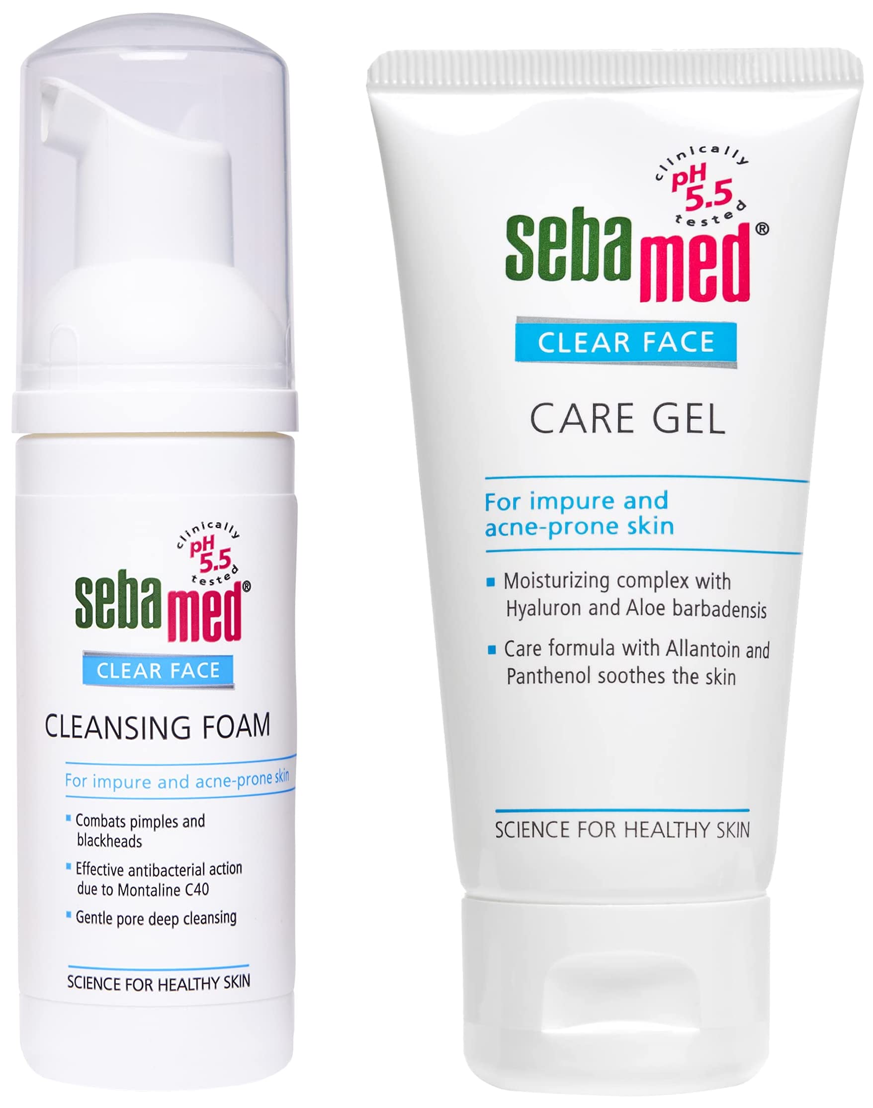 Sebamed Clear Face Care Gel 50mlHelps to combat pimples blackheads and skin impurities panthenol soothes the skin making it soft and supple hence supporting the healing of acne lesions.Sebamed Clear Face Foam 50mlSebamed clear face cleansing foam fights pimples and supports healthy facial skin. Great as a daily cleanser as it is ultra-hydrating without draining your skin of moisture. The refreshing foam gently removes oil while the special formula fights pimple-causing bacteria without making your face red or shiny. Sebamed clear face cleansing foam ensures the gentle and effective deep cleansing of the pores to combat pimples blackheads and skin impurities. Sebamed clear face cleansing foam contains mild soap and alkali free wash active substance removes excessive sebum desquamation and dirt particles without drying the skin. The new active ingredient montaline c40 combats bacteria - reduces bacteria count from 1 lac to 0 in 5 minutes and helps to prevent the formation of new pimples. Vitamin b5 supports the natural regeneration of irritated skin. Sebamed clear face cleansing foam is adjusted to the skin's natural ph value of 5. 5 Protecting and supporting the biological barrier function of the skin's acid mantle to help prevent new pimples from forming. Give your oily skin a feeling of freshness without drying it and help your acne to heal with our clear face cleansing foam. At ph 5. 5 The growth of acne causing bacteria is also minimum.