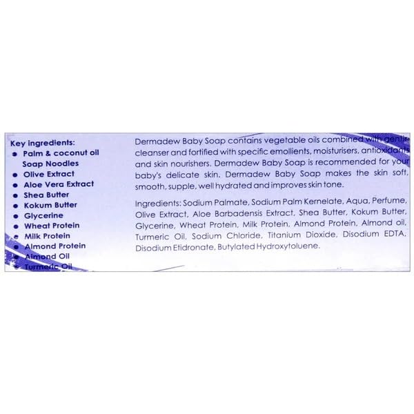 Composition: Key Ingredients: Palm & Coconut Oil Soap Noodles. Olive Extract. Aloe Vera Extract. Shea Butter. Kokum Butter. Glycerine. Wheat Protein. Milk Protein. Almond Protein. Almond Oil. Turmeric Oil. Ingredients: Sodium Palmate. Sodium Palm Kernelate. Aqua. Perfume. Olive Extract. Aloe Barbadensis Extract. Shea Butter. Kokum Butter. Glycerine. Wheat Protein. Milk Protein. Almond Protein. Almond Oil. Turmeric Oil. Sodium Chloride. Titanium Dioxide. Disodium EDTA. Disodium Etidronate. Butylated Hydroxytoluene.