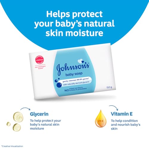 Did you know? Your baby's skin has a natural protective coating of moisturizing oils that covers her skin's outer layer. If these oils get washed away you might leave her tender skin vulnerable to dryness irritation and rash. That's why Johnson's Baby Soap made especially for babies is enriched with vitamin E to help preserve baby skins moisture and cleans without drying delicate skin. It's rich creamy lather gently cleanses and helps keep your baby's skin soft and supple. Johnsons baby soap washes away 99.9% of germs and helps protect the natural moisture of babys delicate and mild skin. Moms trust Johnson's - always mild gentle and effective. In-vitro study performed to check efficacy of germ removal activity up to 99.9 % (2014)
