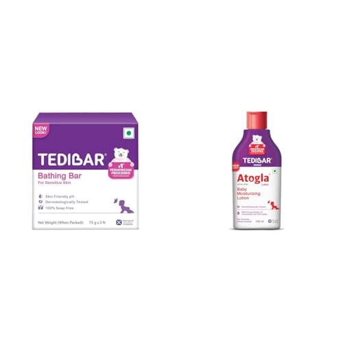 TEDIBAR - Bathing Bar for Babies' Sensitive Skin| Skin-Friendly pH 5.5| Gentle Soap-Free Formula| Prevents Dryness & Rashes| Keeps Baby's skin Soft Supple & Healthy| Pack of 2 - 75gms Tedibar is a soap free bathing bar with skin friendly pH specially developed for baby's tender skin and it is the 1st syndet with a pH of 5.5 to be launched in India. Atogla lotion for baby 200ml | Intense Moisturizing baby lotion for all skin types | Protects Against rashes & prevents skin irritation| For soft and healthy skin The Atogla baby lotion is a uniquely formulated lotion for sensitive skin with the goodness of Ceramide III and GLA (Gamma Linoleic Acid) that prevents and protects your baby's skin from rashes and reduces irritation. Atogla lotion spreads easily on a larger body surface area and can be used from birth or as recommended by doctors. It provides essential nourishment to the skin and makes it soft & smooth. Easy to spread across smoothly and evenly on the baby's skin