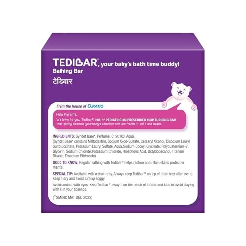 Tedibar is the No. 1 baby moisturizing bathing bar prescribed and supported by Paediatricians.Tedibar being soap-free and alkali-free offers the best protection for your little one's skin. It hydrates the baby's skin and retains moisture. Recommended to maintain baby' skin pH and prevent skin problems like rashes and dryness.