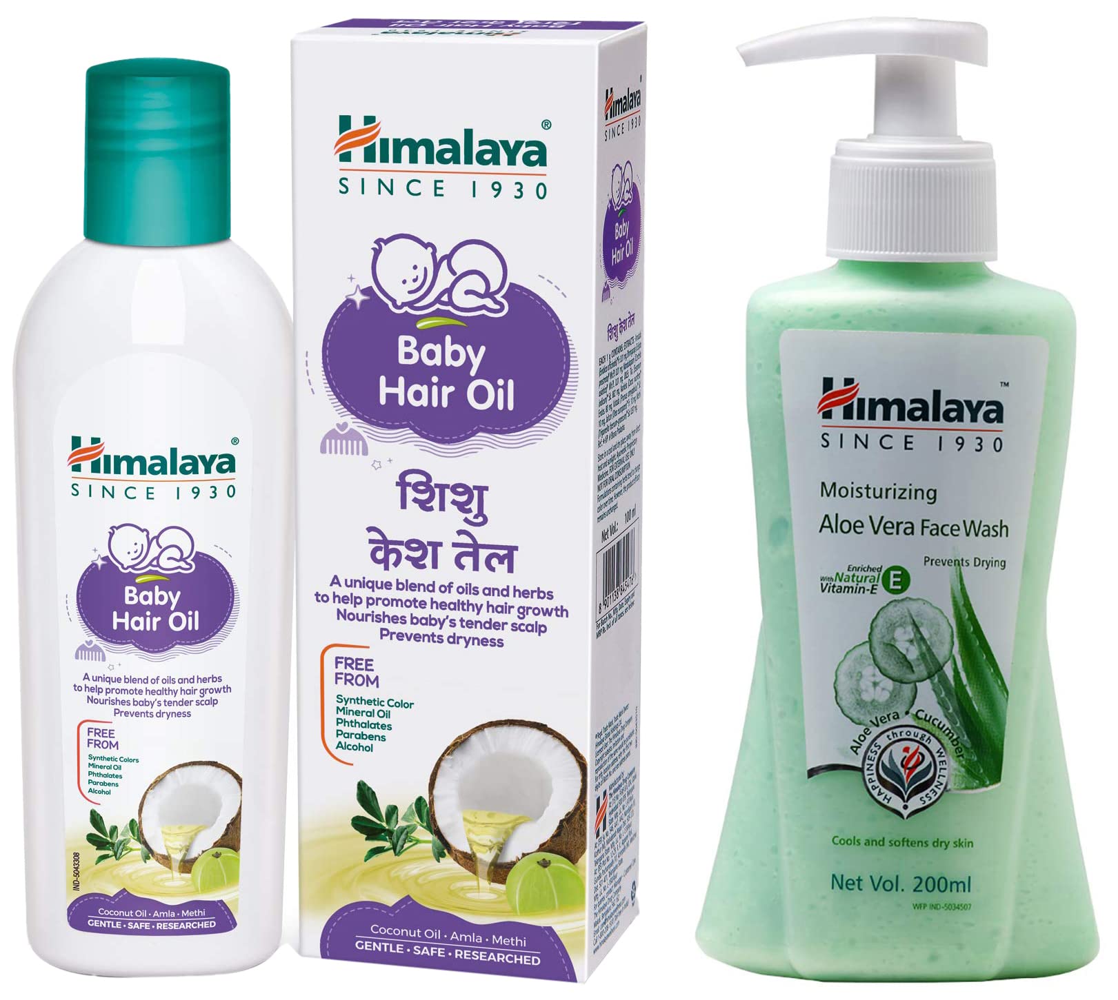 Himalaya Baby Hair Oil 200 ml(1 Count)About Himalaya Baby Hair Oil: Himalaya Baby Hair Oil is specially formulated for babies and is designed to nourish scalp and hair. Infused with a blend of oil and herbs Himalaya Baby Hair Oil helps promote hair growth nourish hair and prevent dryness and keeps the scalp moisturized. Benefits of Himalaya Baby Hair Oil Infused with the goodness of Amla Bhringaraja Gotu kola and Methi which are known to promote hair growth and luster Enriched with the nourishing oils of Coconut Sesame Almond and Olive Helps nourish scalp and hair Moisturizes dry and itchy scalp Free from mineral oil alcohol parabens synthetic color and phthalates Dermatologically tested clinically tested Non-sticky and non-stainingMOISTUR ALOE VERA FACE WASH 200ML INDIAHimalaya's moisturizing aloe vera face wash is a soap-free formulation that replenishes lost moisture from your skin after every wash eradicating dry and stretched skin. It is enriched with cucumber which cools and soothes while aloe vera tones and softens your skin. Our moisturizing aloe vera face wash combines natural ingredients to cleanse your skin leaving it feeling fresh and glowing.