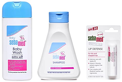 Baby Sebamed Gentle Wash & Lip Defense 4.8 gm|for Dry and chapped Lips|with SPF 30| with Jojoba Oil and Vitamin E & Baby Shampoo 150ml|Ph 5.5| Camomile|Natural moisturisers|No tears Formula