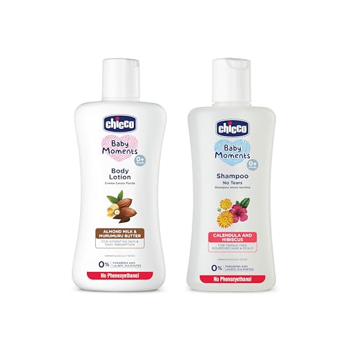 Chicco Baby Moment Body Lotion moisturizes baby's total skin all the day. The Body lotion's ultra-rich formula gives high nourished skin and also restore skin natural moisture that prevents dryness and gives a very soft and smooth baby's skin after use. Chicco Baby Moments No Tears Shampoo is here to keep your baby's hair and scalp nourished and moisturized from its first usage. The new advanced formula gives dual benefit to both baby's hair and scalp by making baby's hair soft and smooth & Preventing hair tangling & dryness of scalp & also Making hair look healthy and shiny.